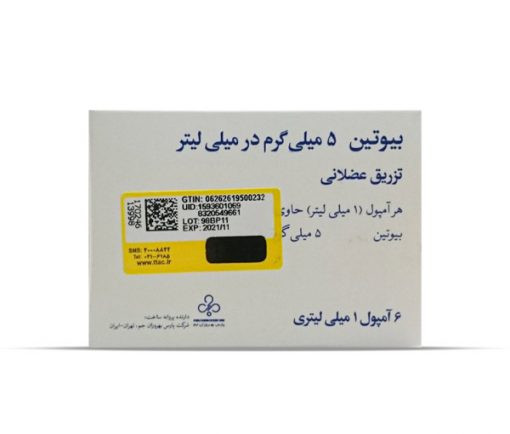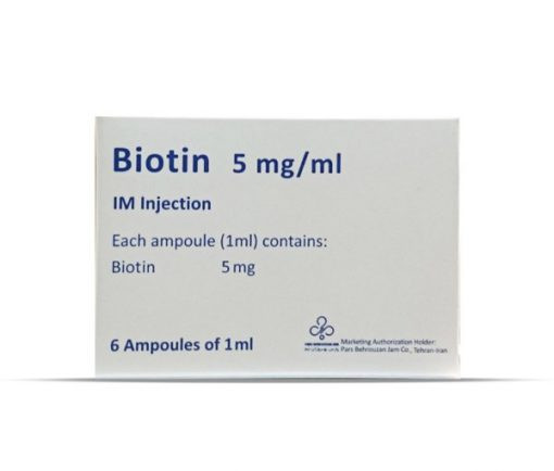آمپول بیوتین ۵ میلی گرم در ۱ میلی لیتر شرکت پارس بهروزان جم در بسته بندی ۶ عددی بوده و هر آمپول آن حاوی ۵ میلی گرم بیوتین است. این محصول حاوی ویتامین B7 یا H می باشد که برای درمان ریزش مو استفاده می شود.